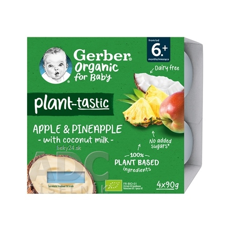 GERBER Organic 100% rastlinný dezert jablko ananás s kokosovým mliekom. BIO ovocná desiata. Od ukončeného 6. mesiaca. Pasterizované. Balené v ochrannej atmosfére.