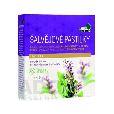 Výživový doplnok, bylinný prípravok (šalviový extrakt, eukalyptový olej) a s vitamínom C.