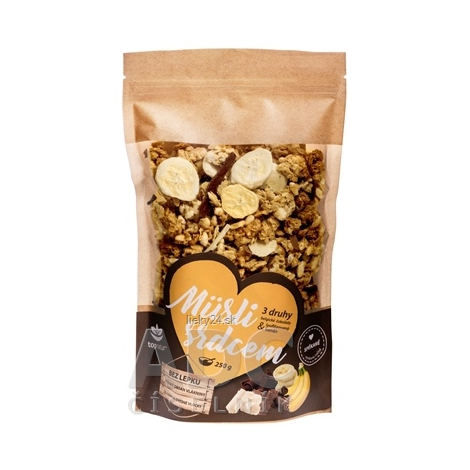 Müsli, spojenie chuti 3 druhov belgickej čokolády (biela, horka, mliečna) a plátkov lyofilizovaného banánu s ovsenými vločkami, chrumkavými plátky kokosu a medu. Zlepované, spekané bezlepkové granule bez palmového oleja a konzervantov.