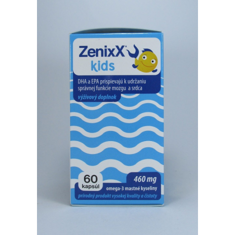 Charakteristika: Zenixx kids je prírodný produkt, výživový doplnok s obsahom 460mg esenciálnych omega-3 mastných kyselín – kyseliny dokozahexaénovej DHA (50 mg) a kyseliny eikozapentaénovej EPA (250 mg). Denný príjem 250mg DHA prispieva k udržaniu normálnej činnosti mozgu. Jedna kapsula denne má priaznivý účinok na správnu funkciu srdca.